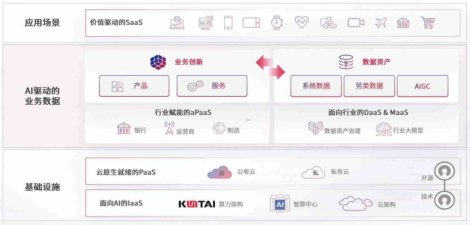 数字时代,,,,围绕企业数字化转型的关键要素,,J9.COM数码开创性的提出数云融合战略和技术体系框架,,,着力在云原生、、、数字原生、、、、AI原生和信创产业上架构产品和服务能力,,为处在不同数字化转型阶段的快消零售、、汽车、、、金融、、医疗、、、、政企、、教育、、、运营商等行业客户提供泛在的敏捷IT能力和融合的数据驱动能力,,,,构建跨界融合创新的数字业务场景和新业务模式,,助力企业级客户建立面向未来的核心能力和竞争优势,,,全面推动社会的数字化、、、智能化转型升级。。。。
